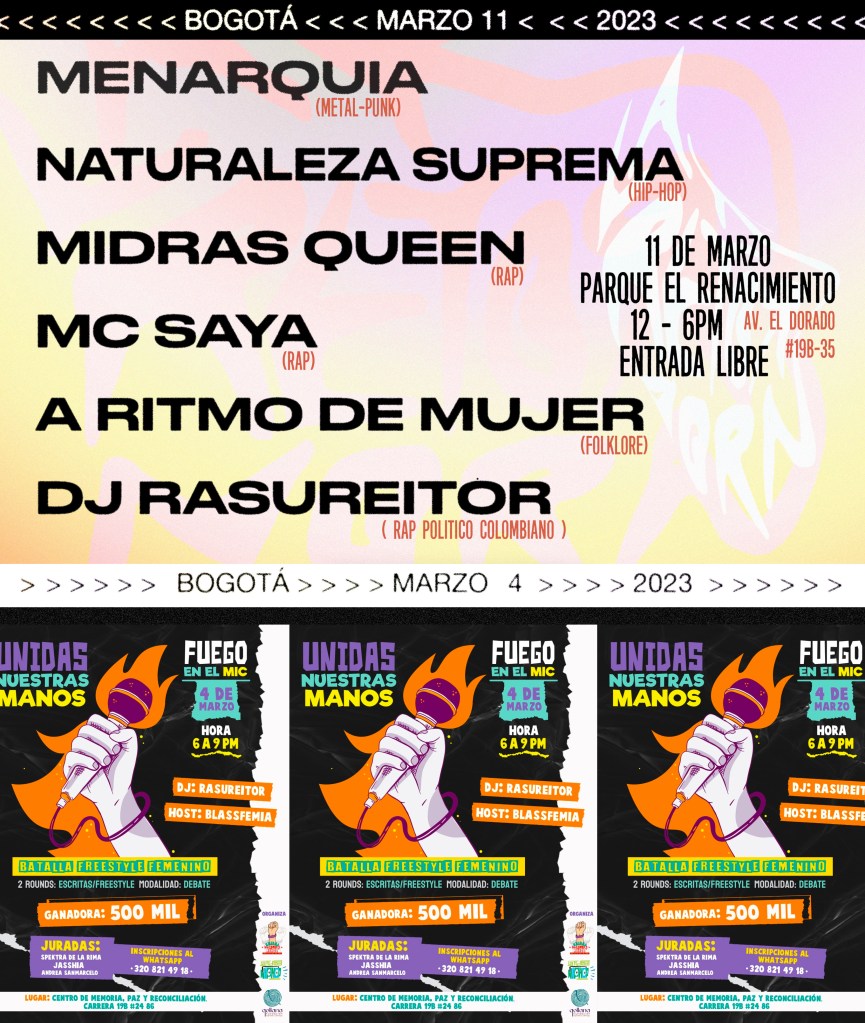 El fin de semana previo al 8M -el sábado 4 de marzo-, nos juntamos con la fundación Qollana y Latidos HipHop bajo el marco del segundo encuentro Unidas Nuestras Manos, un ciclo politico-artístico para la garantía de los derechos de las mujeres. El 11 de marzo de 2023, La Retornora tendrá lugar en el Parque el Renacimiento de 12 PM a 6 PM con entrada gratuita, música en vivo e intercambio social para la reparación histórica de las escenas artísticas latinoamericanas: de todxs para todxs.